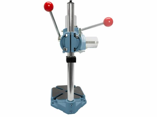 Použitie stojana eliminuje vibrácie a odchýlky pri vŕtaní, čím zvyšuje presnosť práce a znižuje riziko poškodenia materiálu. Upevnenie vŕtačky je riešené cez upínaciu objímku s možnosťou vloženia upínacích vložiek (redukcií) pre rôzne priemery krku vŕtačiek – 43 mm, 39 mm a 25 mm. Pohyb vŕtania je riadený ovládacou pákou s pojezdovou dĺžkou 60 mm, ktorá umožňuje plynulé a kontrolované vedenie nástroja.
