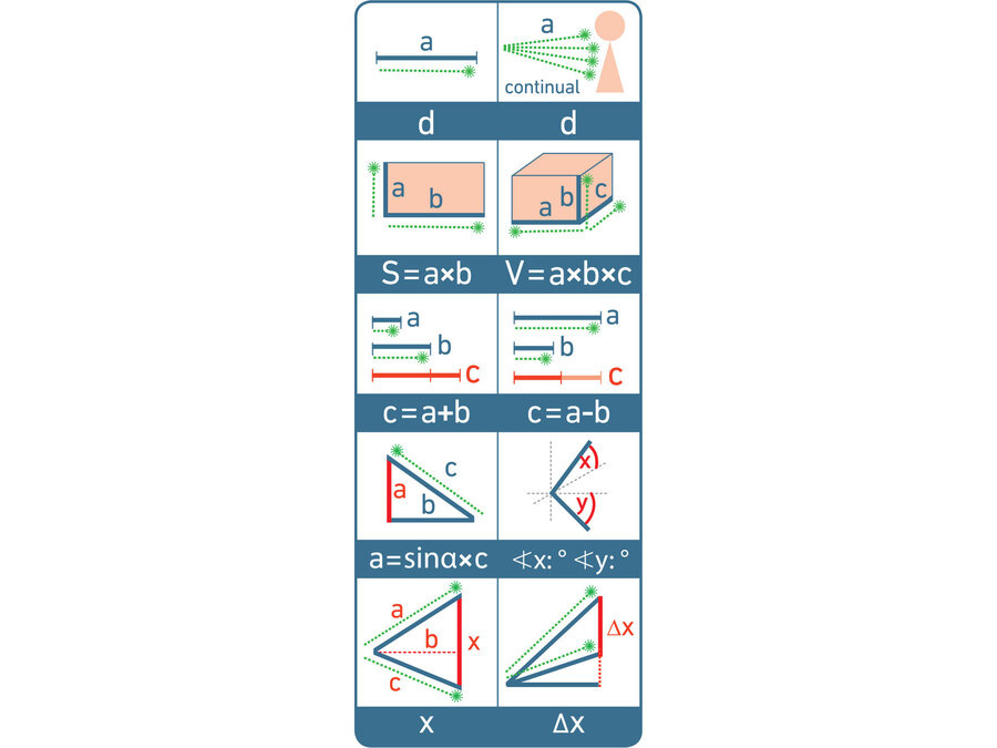 Funkcie merania: - vzdialenosť s možnosťou kontinuálneho merania - pripočítanie/odpočítanie k už nameraným hodnotám - plocha - objem - nepriame meranie vzdialenosti výpočtom (goniometria) - meranie uhla výpočtom z referenčného bodu - sklon v horizontálnej i vertikálnej rovine