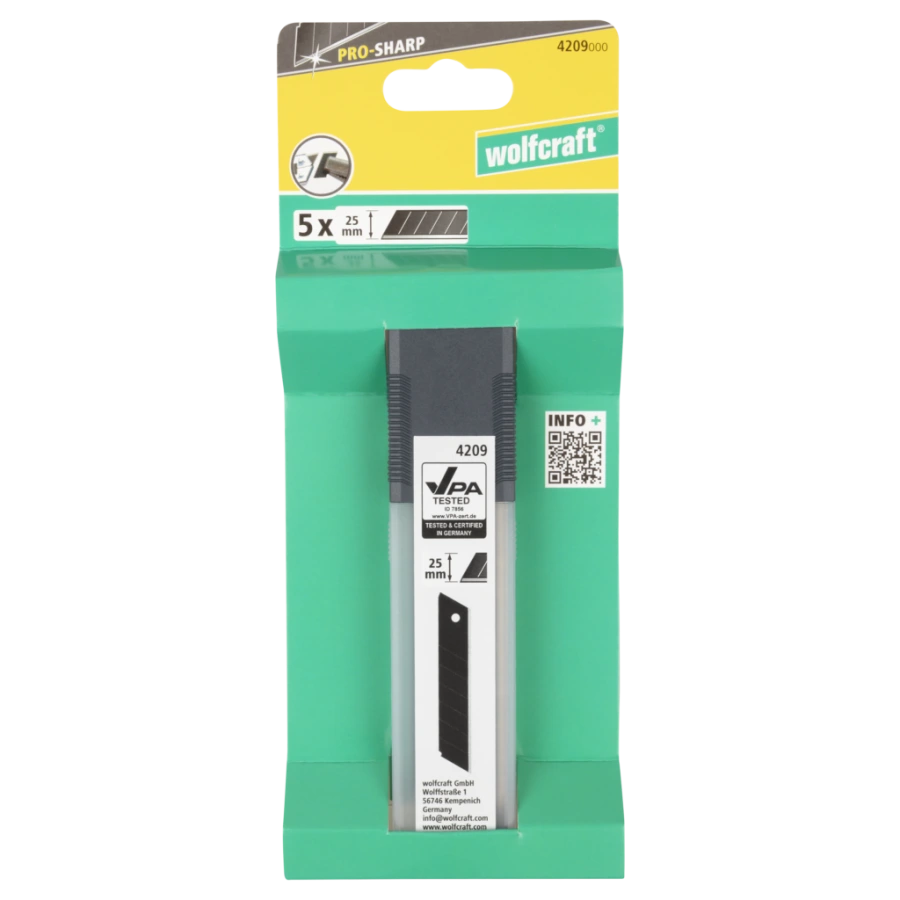 Päť čiernych extra ostrých, 25 mm širokých odlamovacích nožov z vysokokvalitnej uhlíkovej ocele ponúka vďaka špeciálnemu ostreniu s certifikátom VPA o 30 % lepší rezný výkon ako bežné nože. Sú kompatibilné so všetkými komerčne dostupnými nožmi s odlamovacou čepeľou s priemerom 25 mm. Čepele majú osem odlamovacích segmentov. Dajú sa bezpečne skladovať v priehľadnom plastovom boxe.