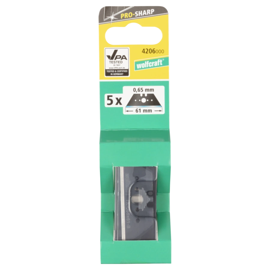 Päť čiernych extra ostrých lichobežníkových čepelí (61 mm × 0,65 mm) z vysokokvalitnej uhlíkovej ocele ponúka vďaka špeciálnemu ostreniu s certifikátom VPA o 30 % lepší rezný výkon ako bežné čepele. Sú kompatibilné s bežne dostupnými nožmi s trapézovou čepeľou. Dajú sa bezpečne skladovať v priehľadnej plastovej škatuli.