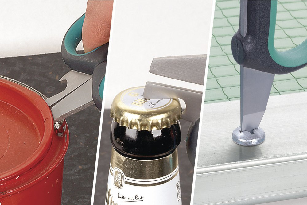 univerzálne nožnice do domácnosti s ergonomickými rukoväťami so špeciálnou geometriou rezania s doplnkovými funkciami ako skrutkovač, otvárač fliaš, plechoviek balenie: blister na karte