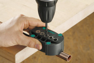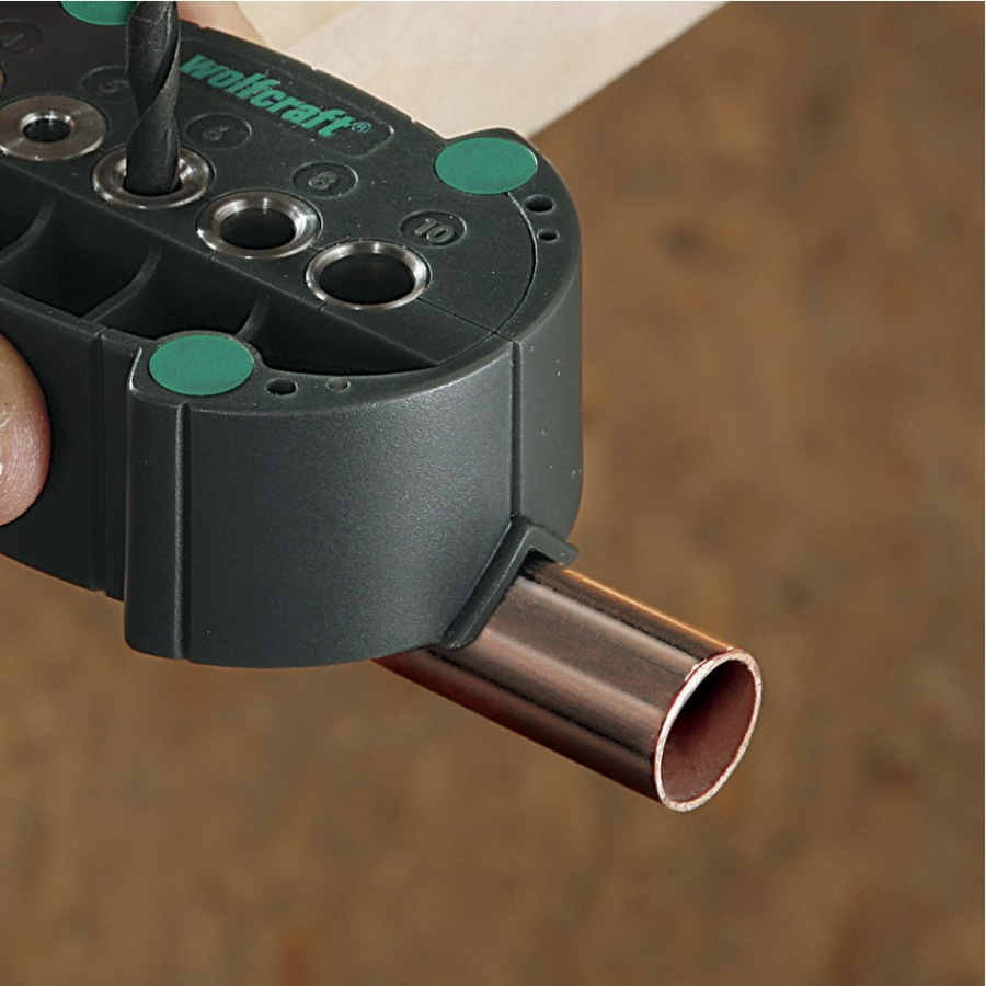 žádný prokluz vrtáku na hladkých plochách díky gumovému nárazníku, polohovací čáry pro přesné vrtání, integrovaná V – drážka k bezpečnému upnutí kruhových materiálů, 5 přesných vrtacích pouzder z kovu pro vrtáky o průměru 4, 5, 6, 8 a 10 mm