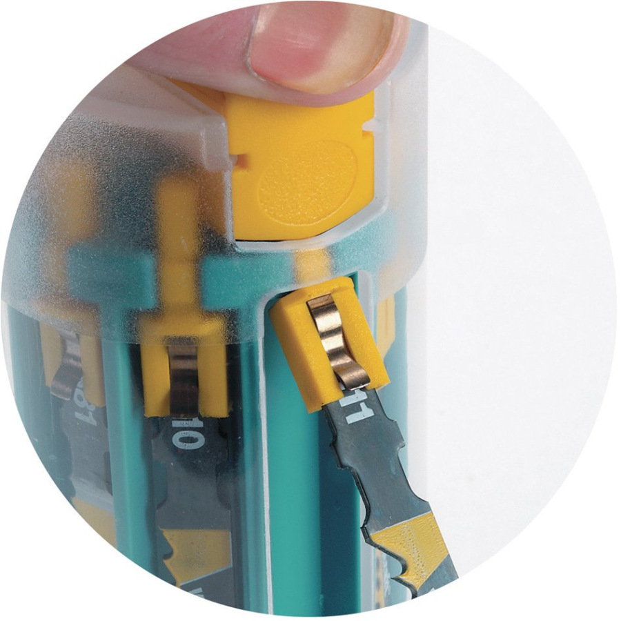 Komfortné vybratie jednotlivých listov stlačením tlačidla, voľný pohľad na listy vďaka priehľadnému vysoko transparentnému plastovému puzdre.