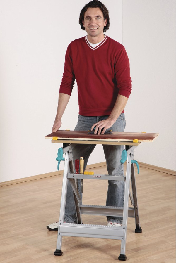 Upínací a pracovní stůl, vysoká úroveň stability, MDF deska, 2 upínací desky, 2 kličky, odkládací plocha pro nářadí, 4 umělohmotné čelisti pro ploché upínání, sklápění pro snadnou skladovatelnost, zatížení max. 180 kg