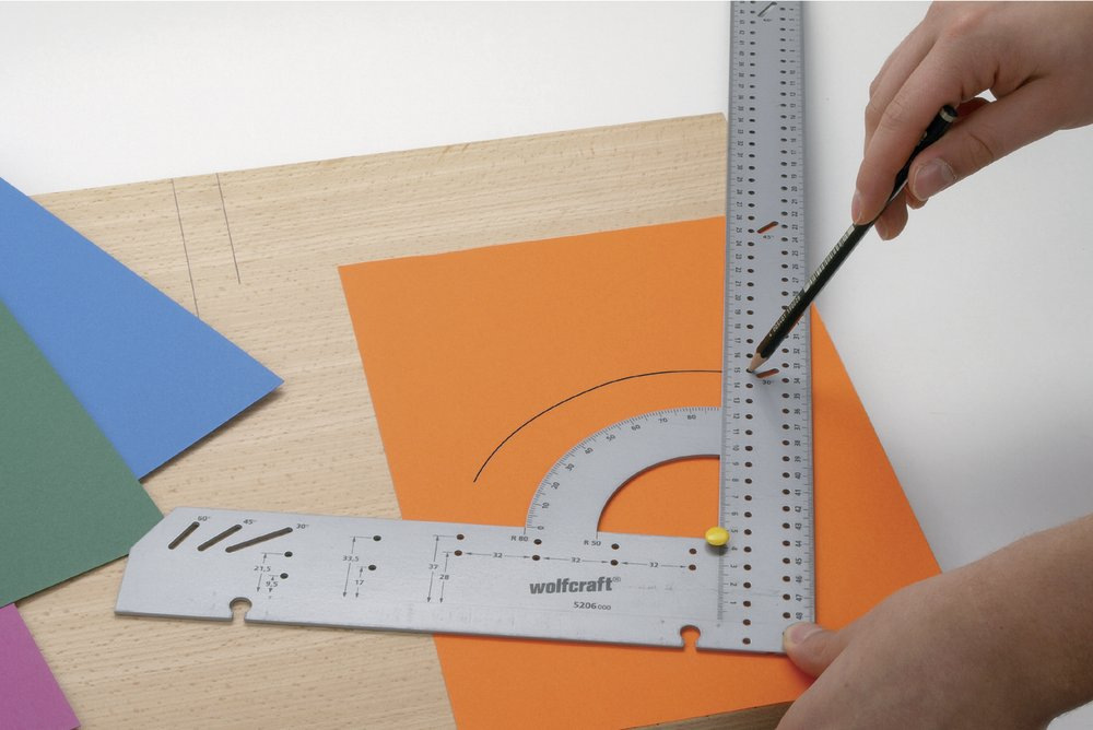 Univerzálny úholník na meranie, ryskovanie, značenie a vedené rezanie.